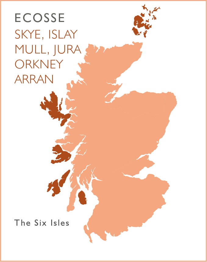 The Six Isles se caractérise par ses notes tourbées et fumées, qui constituent le grand point commun à toutes ces distilleries. Il puise la bruyère à Orkneys, les épices à Skye, et bien d’autres arômes ailleurs.